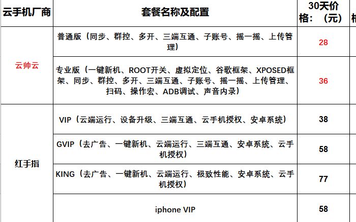 1、云帅云手机和红手指对比。云帅云手机的价格月卡28,专业版才36元,云帅云手机专业版的功能在红手指就需要58元以上,价格便宜的不是一点二点了,至少便宜了50%以上了。