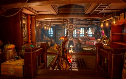 位于调查帆船后部的客舱就是猎人的房间,也可以从这里前往后方甲板。客舱上方是桅杆,从构造上看,其基部就在房间中心。除了新怪物雕像与埃尔迦德特有的壁饰外,曾藏在炎火村自家挂轴后面的“神秘情报商玄又玄”或许也来了……
