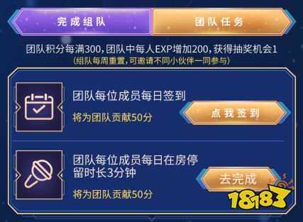 在活动页面可以创建战队或者加入其他队伍,队伍人数满5人即为组队成功,团队获得300EXP。团队成员完成每日签到或者在皮皮蟹语音房间停留3分钟,皆可获得50贡献分,当团队贡献分满300,团队每位成员都能获得200EXP和1次抽奖机会。想要拿到更好的奖励,EXP和抽奖机会都是非常重要的,大家记得叫上队友一起完成团队任务哦。