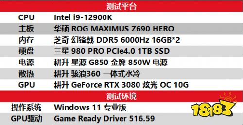 本次测试采用Intel i9-12900K CPU、32 GB DDR5 6000Hz内存、华硕ROG MAXIMUS Z690 HERO主板、耕升 GeForce RTX 3070 Ti、三星980 PRO 1TB SSD硬盘和耕升 骇浪360一体式水冷来进行,确保测试平台不会限制显卡的性能,能让显卡发挥出效率。同时GPU驱动更新至最新Game Ready Driver 516.59版本,以确保测试平台能以最稳定最佳的状态来测试游戏。