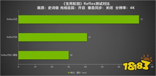 从测试数据上来看,开启NVIDIA Reflex技术后,延迟从72ms降低到41ms,如果打开增强模式,延迟可以降低至30ms。从游戏中体验的话就是射击、打斗更加流畅,击杀敌人更加迅速,操作更加灵敏。在高分辨率下对比体验更加突出,推荐使用高分辨率的玩家开启Reflex技术,更敏捷迅速的打斗动作可以带来更流畅的游戏体验。