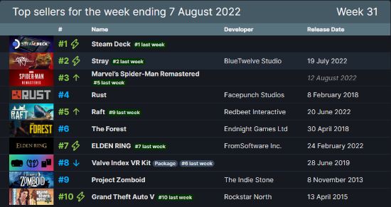 Steam公开了上一周(截至8月7日)的销量排行,榜单第一名仍继续由V社掌机Steam Deck夺得,本周已经是Steam Deck霸榜的第十周。猫猫游戏《流浪》夺得了榜单的第二名,第三名则是《漫威蜘蛛侠:复刻版》。
