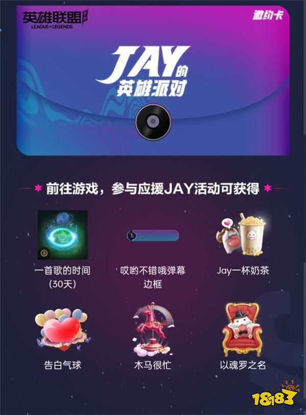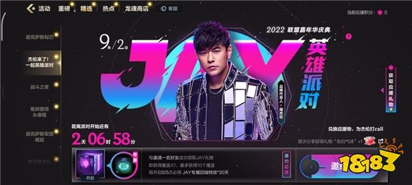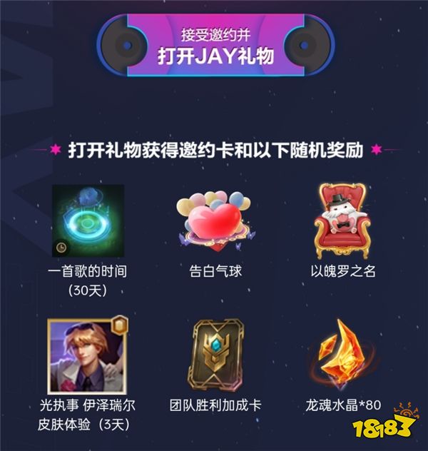9月2日20:30前,在手游内邀约好友参与活动,你和好友都可领取杰伦为召唤师准备的JAY礼物和魔盒!开启魔盒随机获得一份奖励,敲重点:每开启5次魔盒必得杰伦专属回城特效“一首歌的时间”哦!快和开黑好友一起收下“哥”的心意,让“哥”的特效炫满峡谷!