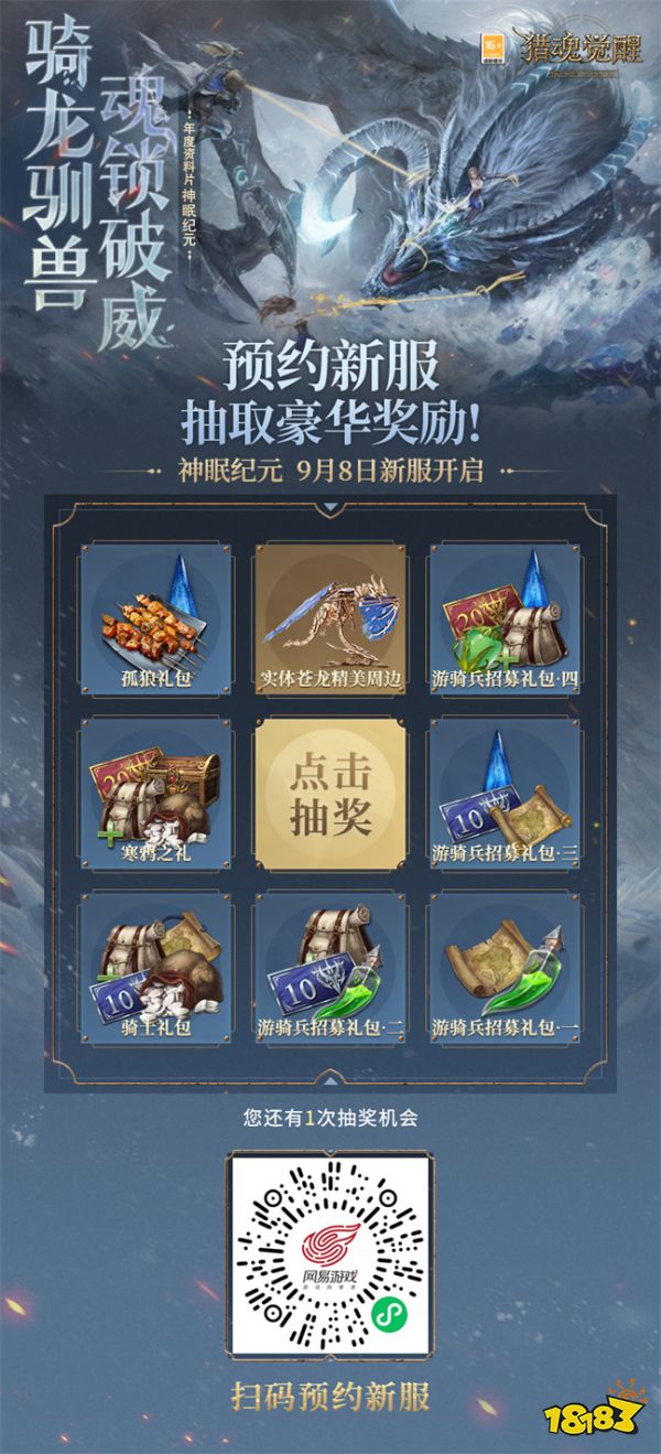 《猎魂觉醒》年度新服“神眠纪元”将于9月8日重磅开启,新服有奖预约火爆进行中!微信扫码预约即可参与抽奖,加入官方社群,更有先锋资讯、定制福利,助力冲刺新服!