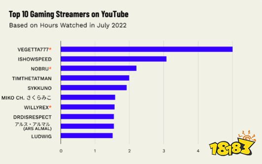 YouTube的7月GamingLive排行榜也反映出一个庞大的拉丁美洲社区,其中西班牙的 Vegetta777 排名第一,巴西的 Nobru 排名第三。