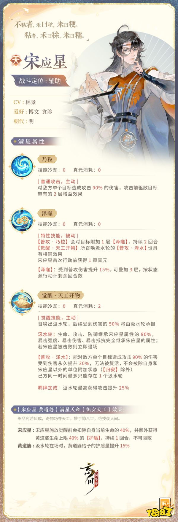 宋应星在忘川中战斗作为辅助出战!普通攻击,对敌方单个目标造成伤害,并在攻击前驱散目标带有的两层增益。特性技能会为普攻命中目标附加一层【泽噬】效果,后续该目标受到普攻伤害提升15%,可叠加3层,觉醒技能召唤的汲水轮普攻也会具有同样的效果,同时宋应星首次行动前获得1颗真元。觉醒技能会召唤出汲水轮,后续宋应星受到50%伤害由汲水轮承担。汲水轮继承一部分宋应星的属性,但受到伤害永久提升30%,且无法被复活,同一时间最多存在一个汲水轮。