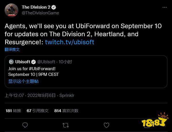 在推特上,《全境封锁2》官方账号确认,在 9 月 11 日举办的 Ubisoft Forward 发布会活动中讨论游戏的更新,以及《中心地带》和《曙光》两部作品的详细信息。
