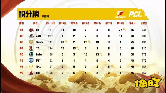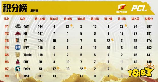 最终,NH战队凭借着高达312分的总积分甩开分差,一骑绝尘拿下季后赛冠军!Tianba战队一鼓作气反超4AM战队以270分位居第二;常规赛积分榜第一的17战队后来居上,以261分拿到季后赛季军: