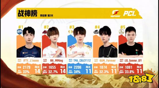 季后赛首日比赛,Tianba战队和4AM战队的战场让人大呼过瘾!4AM战队单日拿下三鸡,并以近四十个淘汰数拿下96分,登上首日的积分榜榜首!队内xxxLu选手和lzqq选手分别以26%和26.3%的得分贡献率稳坐4AM战队功臣宝座。Tianba战队状态火热,二连鸡拿下首日第四,特别是在第三局比赛中Tianba战队单局拿下了十四个淘汰数吃鸡;队内LinShu21选手以惊人的2521伤害值和33.8%的得分贡献率荣登首日战神榜榜首。