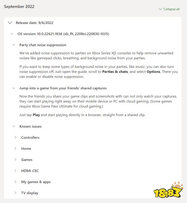 微软于9月6日发布了Xbox Series X/S的最新更新,添加了玩家在进行派对聊天中抑制噪音的功能,可以帮助玩家在专心游戏时,消除队伍内不必要的噪声,如手柄的按键声、玩家呼吸声以及背景噪音。该功能现已推出,玩家可以将Xbox更新至最新系统体验。
