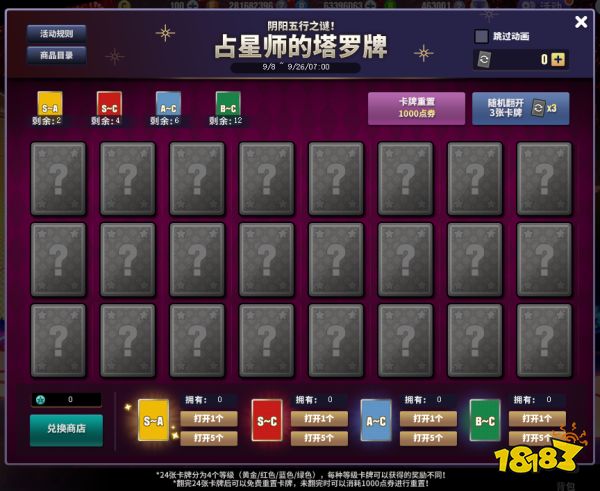 活动规则:可以使用[塔罗抽取券]来进行翻牌!一次会出现24张卡牌,分别是黄金:2张/红色:4张/蓝色:6张/绿色:12张。每种卡牌被翻出来的概率都相同。未翻完24张卡片时可以消耗1000点券进行重置。翻完24张卡牌后可以免费进行重置。卡牌重置后可以重新翻24张卡牌。卡牌重置后重新出现的卡牌中每个等级卡牌数量不变。获得卡牌后点击打开按钮按照概率获得各等级的奖励。