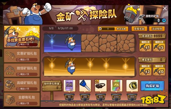活动规则:玩家使用矿镐敲碎原石后可以获得各种物品。在敲碎普通原石时有概率得到黄金原石。获得的黄金原石会移动到下方的金矿里。因为黄金原石更坚硬,所以需要使用更多的矿镐才能得到宝物。根据累积敲碎的原石数量,可以获得特别的礼物。