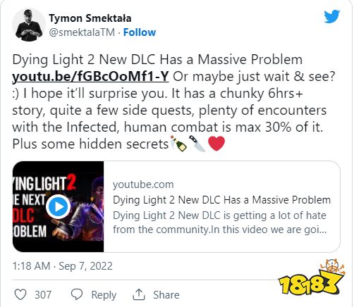 《消逝的光芒2》首席设计师Tymon Smektala今日在推特上表示,DLC“血腥纽带”提供了超过6个小时的内容,有相当多的任务会和感染者接触,与人类的战斗仅仅占到了30%。