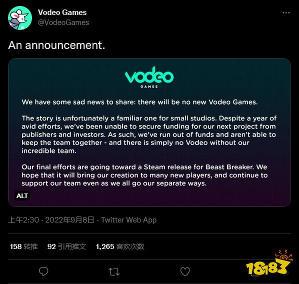 Vodeo Games 在其 Twitter 帐户上宣布将关闭。