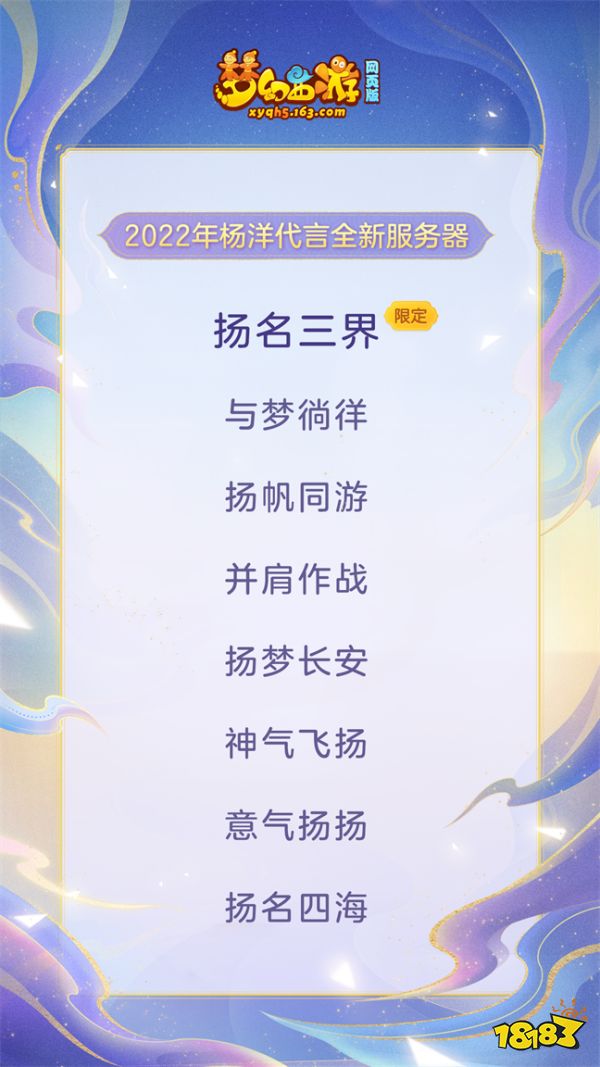 此次游戏内还开放了扬名三界、与梦徜徉、杨帆同游等多个代言全新服务器,其中包括限定服务器“扬名三界”,该限定服务器将于9月16日开启,欢迎粉丝羊毛、少侠与杨洋同闯三界!