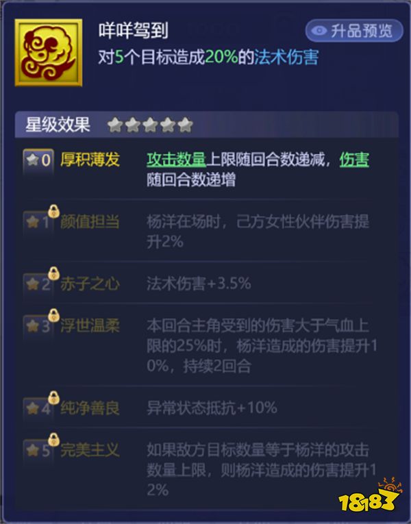 伙伴杨洋其拥有多项技能,包括咩咩驾到(对5个目标造成法术伤害);厚积薄发(攻击数量上限随回合数递减,伤害随回合数递增);颜值担当(杨洋在场时,己方女性伙伴伤害提升);赤子之心(法术伤害);浮世温柔(主角当前回合受到伤害>气血上限时,杨洋伤害提升);纯净善良(异常状态抵抗);完美主义(若敌方存活目标数量=本回合攻击数量上限,杨洋伤害提升)。