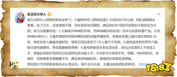 激动,是因为史玉柱先生对《原始征途》的重视程度,超乎他们的想象。而忐忑,是因为史玉柱对游戏目前版本并不满意,他发布微博时表示:“很久没抓巨人网络的具体业务了。打磨两年的《原始征途》计划9月21号公测,团队邀请我去看看。玩了几天,总体感觉不错,但还是有些问题的,建议他们21号的开区暂时不能定位为公测。”