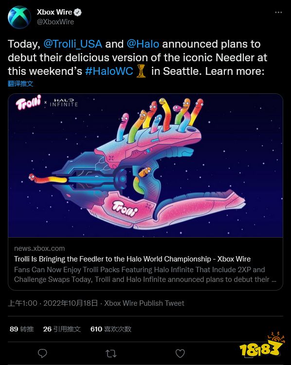 参观 Trolli 展位的人都有机会赢取《光环:无限》联名的 Trolli 礼包,以及双倍 XP 代币和《光环:无限》的挑战置换器。礼包中包括四种口味,分别是原版多重口味蠕虫软糖、超酸蠕虫软糖、酸味软糖和爆浆酸味蠕虫软糖。这些不同口味将在美国各地零售店限时发售。