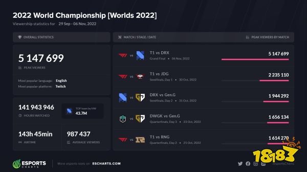 据Esports Charts报道,至少有510万名观众通过直播平台同时观看了《英雄联盟》S12总决赛(不包含国内的数据),峰值出现在DRX与T1比赛的第二场,观众分布在多个频道,拳头自己的Twitch频道达到了99万的峰值,而《英雄联盟》韩国电竞频道达到了69.2万。