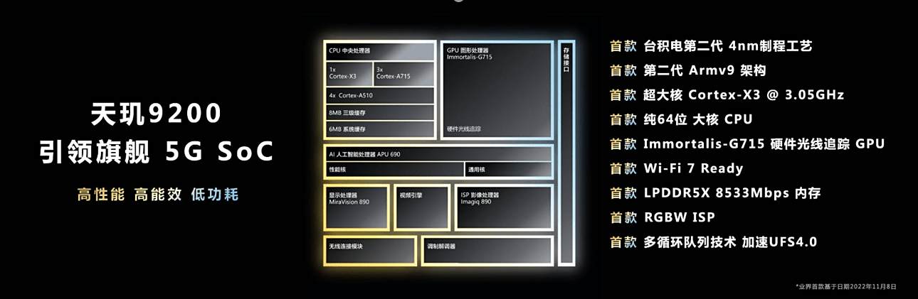从官方公布的账面来看,天玑9200堆料十分下本,采用了台积电第二代4nm工艺和第二代Armv9架构,搭载八核旗舰CPU,包括1个主频高达3.05GHz的Cortex-X3超大核,3个2.85GHz主频的Cortex-A715大核,以及4个1.8GHz主频的Cortex-A510小核,并且性能核心全部支持纯64位应用,要知道64位能带来更高的能效表现,是高端芯片发展的必然趋势。