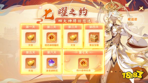 第二重福利——超丰厚公测福利活动!玩家进入游戏后,即可参与包括“七曜之约”“甜心守护”在内的多重福利活动,领到各类丰富的道具资源、橙将自选礼包,助力西行,养成无需烦忧!