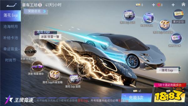 在豪车工坊的奖池中,除了万众瞩目的莲花Evija外,还有其专属涂装惊雷一瞥和暗雷涌动,在王牌赛道上,展现疾如雷电的非凡性能!莲花Evija升级宝箱和蓝图可助力赛车提升等级,解锁更多组建和大招特性;而轮毂自选礼中则包含了彩虹糖、恒久钻戒和雪国物语三款超人气轮毂供车手自由选取!