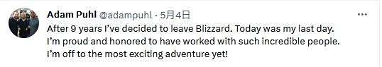 设计师Adam Puhl今日发推,表示“9年后,我决定离开暴雪。今天是我在这里的最后一天。我很自豪也很荣幸能和这些了不起的人一起工作。我要开始最激动人心的冒险了!”