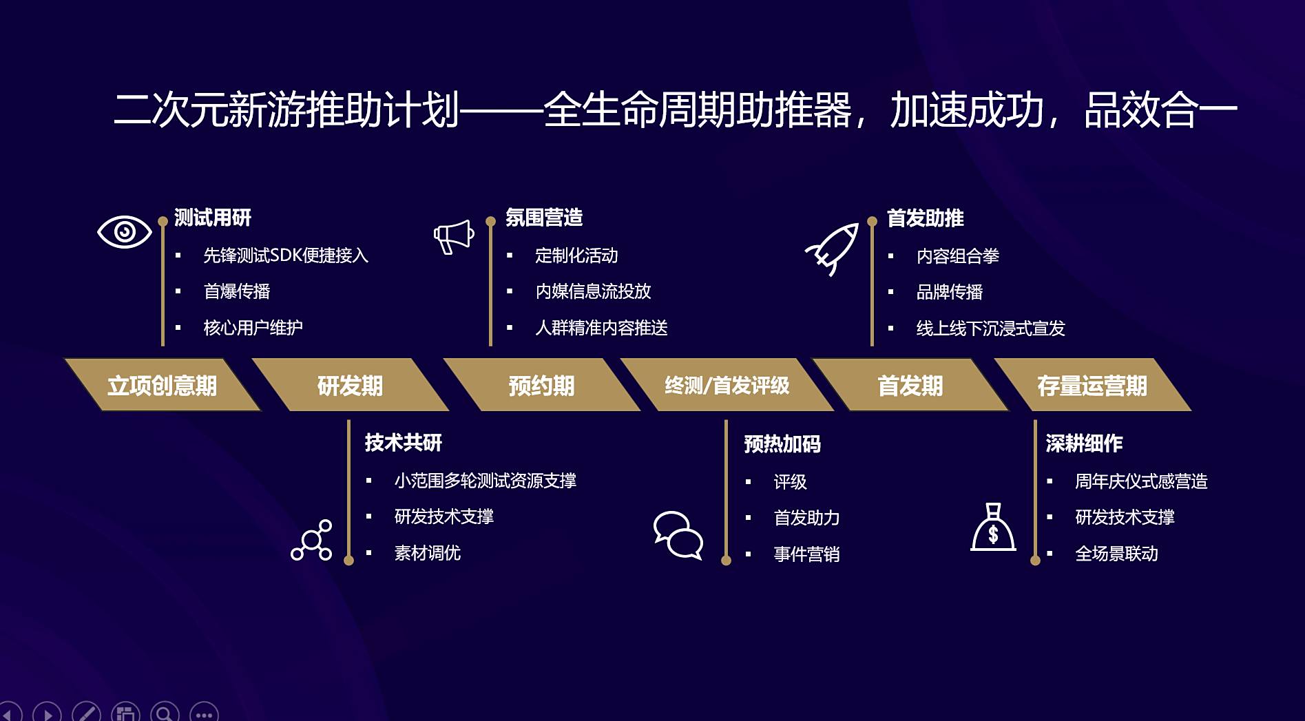 不少游戏开发者深知渠道运营的重要性,但仍会存在一些疑问,比如什么时间节点开启预约比较合适?如何在预约阶段蓄水引爆首发?华为游戏中心总经理提到,新游立项的那一刻,就是对核心用户运营的起点。对此,华为游戏中心新游助推计划覆盖“立项-研发-预约-终测-首发-存量运营”新游全生命周期,基于亿级流量基础和软硬协同的技术优势,在不同阶段为新游提供研发技术支撑、定制化首发策略和用户留存等服务。