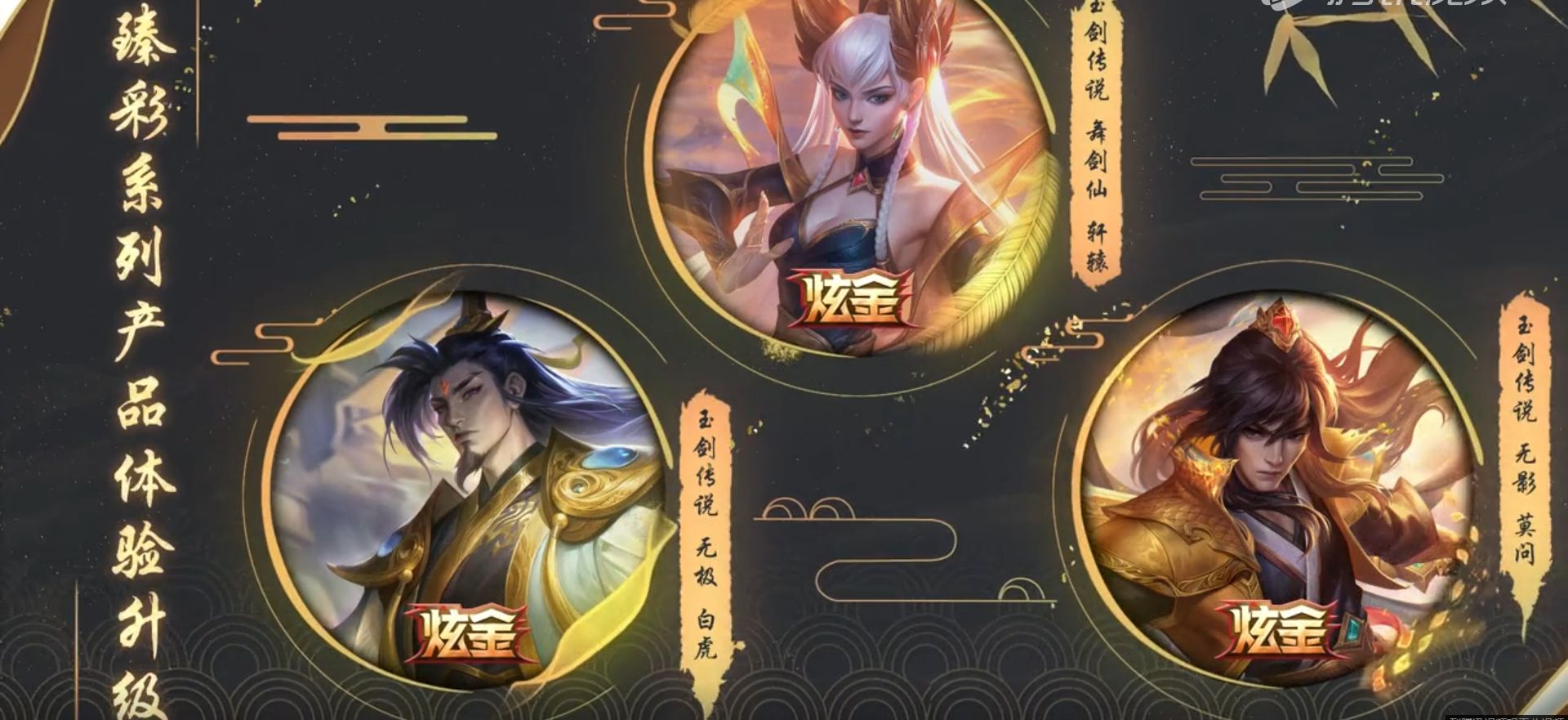 当然除去上线一些臻彩皮肤之外,本次13.13版本的更新,更是会同步推出三款炫金臻彩,炫金代表了更好的臻彩等级,象征着皮肤的稀有度和华丽感,可谓是观感十足。本次推出的皮肤是玉剑传说系列,包括剑圣、刀妹和男刀的皮肤。
