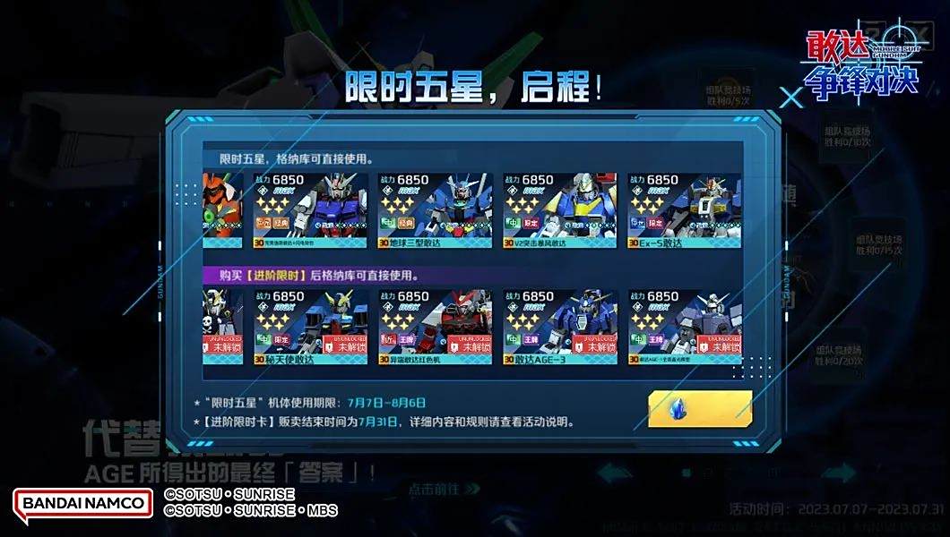 进阶限时五星机体:多鲁基斯III、海盗敢达X1全覆式、秘天使敢达、异端敢达红色机 红龙、敢达AGE-3、敢达AGE-1全装备光辉型。