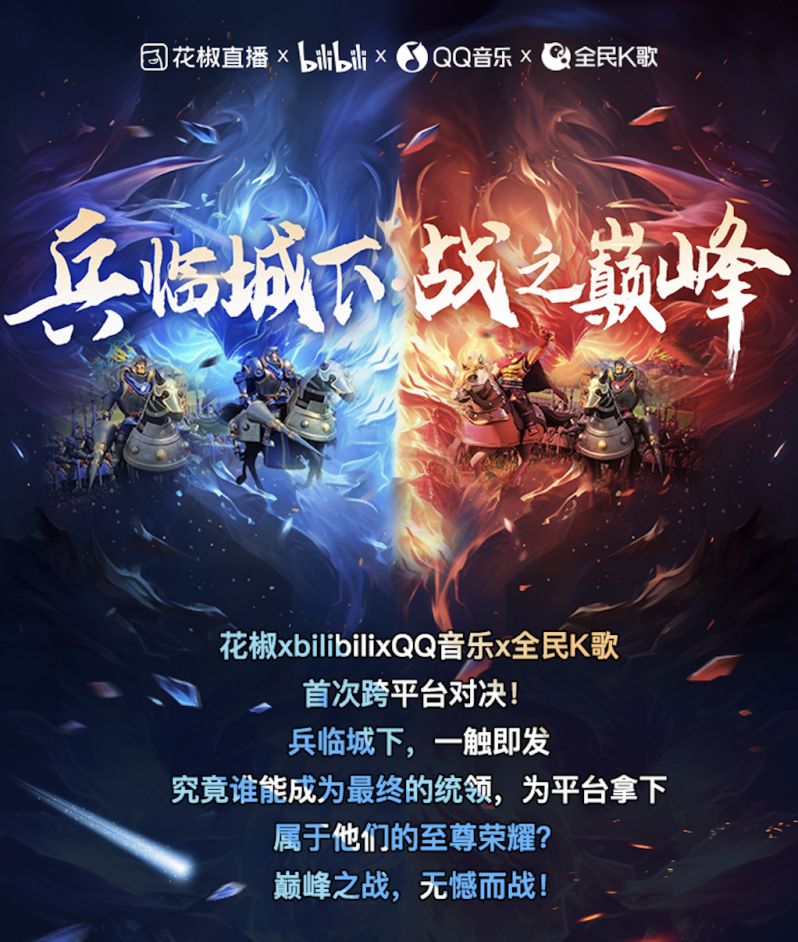 花椒直播携手Bilibili、QQ音乐、全民K歌,受邀参加弹幕玩法《兵临城下》四方争霸赛。一场史无前例的跨平台巅峰对决,即将引爆全网的目光。从10月22日至27日,火热激情将在这六天里碰撞出激烈的火花,这不仅是一场热血的赛事,更是一场荣誉的较量!