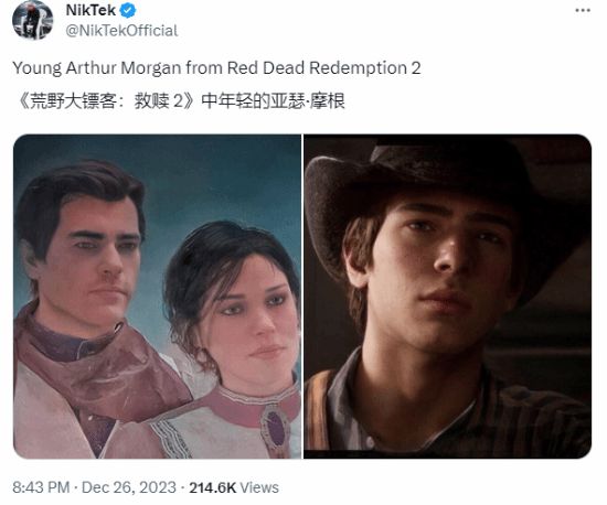 在《荒野大镖客2》中,有一张男主亚瑟·摩根和玛丽年轻时的照片,年轻时的亚瑟十分英俊帅气,后来有网友对这张黑白照片进行了着色和画质增强,我们见到了一个更真实的年轻亚瑟。