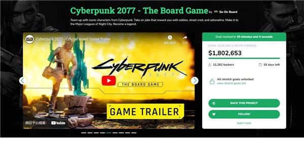 由CDPR和Go On Board联合开发《赛博朋克2077》桌游《赛博朋克2077:The Board Game》于太平洋时间早上6点在众筹网站Gamefound开启众筹,10分钟后,该项目就筹集到了目标资金(10万美元),目前总众筹金额已经达到180.2万美元,是原本目标的1802%。