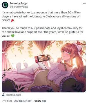 12月11日,视觉小说《心跳文学部》系列发行商Serenity Forge宣布,《心跳文学部》全系列游戏玩家数量已超过3000万,Serenity Forge对玩家社区的支持表达了感谢。