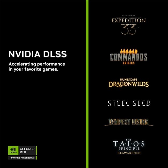 RuneScape: Dragonwilds、《风暴崛起》(Tempest Rising)与《塔罗斯法则:重启》(The Talos Principle: Reawakened)现已支持DLSS帧生成与DLSS超分辨率。《光与影:33号远征队》(Clair Obscur: Expedition 33)首发即支持DLSS超分辨率,Commandos: Origins现已上线并支持DLSS超分辨率。