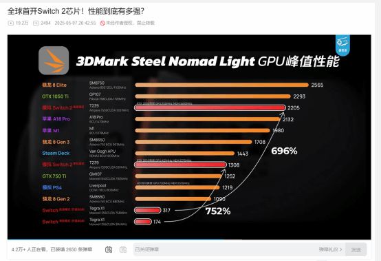 有玩家对NS2目前的性价比表示不满:根据极客湾给出的评测数据,NS2掌机模式峰值性能堪堪打败GTX750Ti、底座模式也无法同1050Ti竞争,仅略高于苹果A18 Pro。当然,NS2要比Switch1时代的性能翻了好几倍,提升极为巨大。(模拟数据)