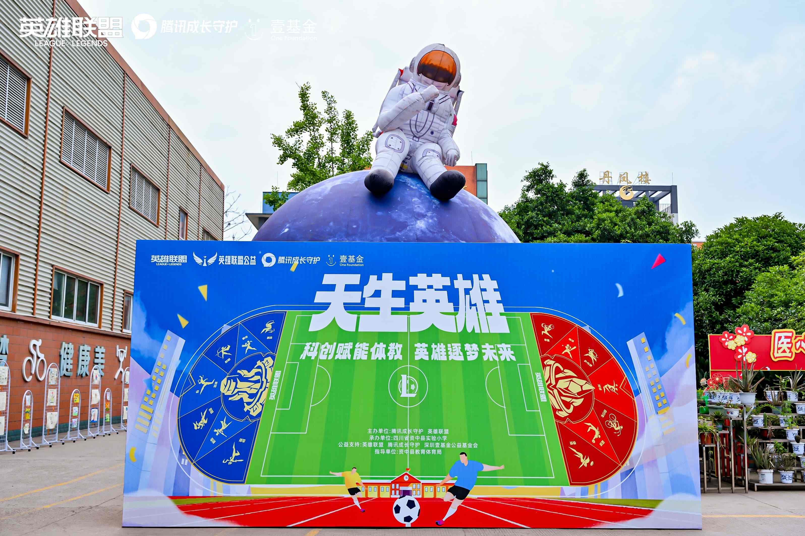 2025年5月,在国家体育总局、内江市、资中县等各级领导的见证下,英雄联盟公益联合腾讯成长守护、壹基金以及两位公益大使——刚刚入选英雄联盟名人堂的简自豪(Uzi)、LPL001号选手明凯(Clearlove),来到四川省内江市资中县实验学校,通过由公益课、科技节、公益运动场落成仪式、趣味足球赛等环节组成的“天生英雄”公益活动,为乡村青少年打造了一场融合科技、体育与公益实践的成长之旅。