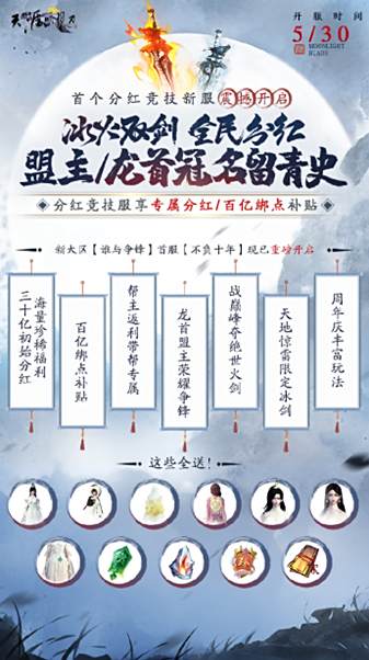 首个百亿分红服【谁与争锋】大区首服【不负十年】5月30日重磅开启!抢占先机,共聚新服,【天煞·寰宇寂灭】震撼出世,【天煞·造化独尊】重现江湖!陨焰之石、孔雀翎回馈帮主;共聚新服,血战可荣登风云榜夺取更多分红币,闲坐亦可瓜分百亿绑点以及初始三十亿分红。