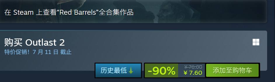 第一人称恐怖游戏《逃生2(Outlast 2)》在最近的Steam夏季特卖中开启了一折特惠,售价7.6元,为历史最低。