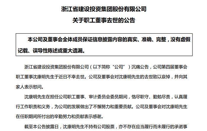据大鱼财经获悉,浙江省建设投资集团股份有限公司(股票代码:002761.SZ,简称“浙江建投”)近日公告,公司职工董事沈康明先生不幸逝世,终年54岁。公开信息显示,沈康明于1971年7月出生,系浙江安吉人。另据其他消息源透露,其离世疑似涉及坠楼意外。7月7日下午,记者多次尝试拨打浙江建投对外公开电话以核实相关情况,但始终未能接通。