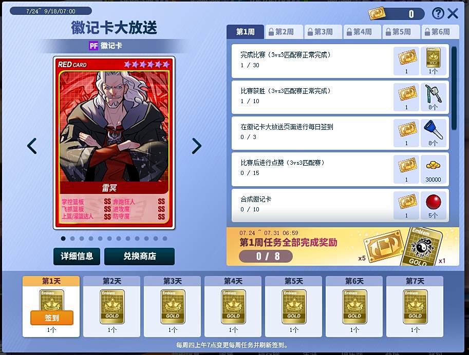 玩家每天签到都可以领取徽记卡,完成每周任务都兑换券以及奖励。任务包括完成比赛、比赛获胜、比赛点赞、合成徽记卡等同样可以获得兑换券以及奖励,活动结束后可以在兑换商店兑换6星徽记卡,玩家可以选择适合自己职业的徽记卡。