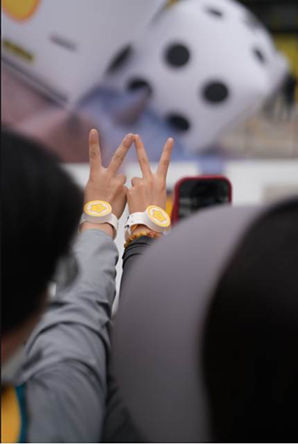 现场可体验通过NFC秒绑APP,寻找场馆内的星向标,手环互动点亮地图,投掷骰子累积星能赢得抽奖机会,解锁限定徽章,领取限定周边。