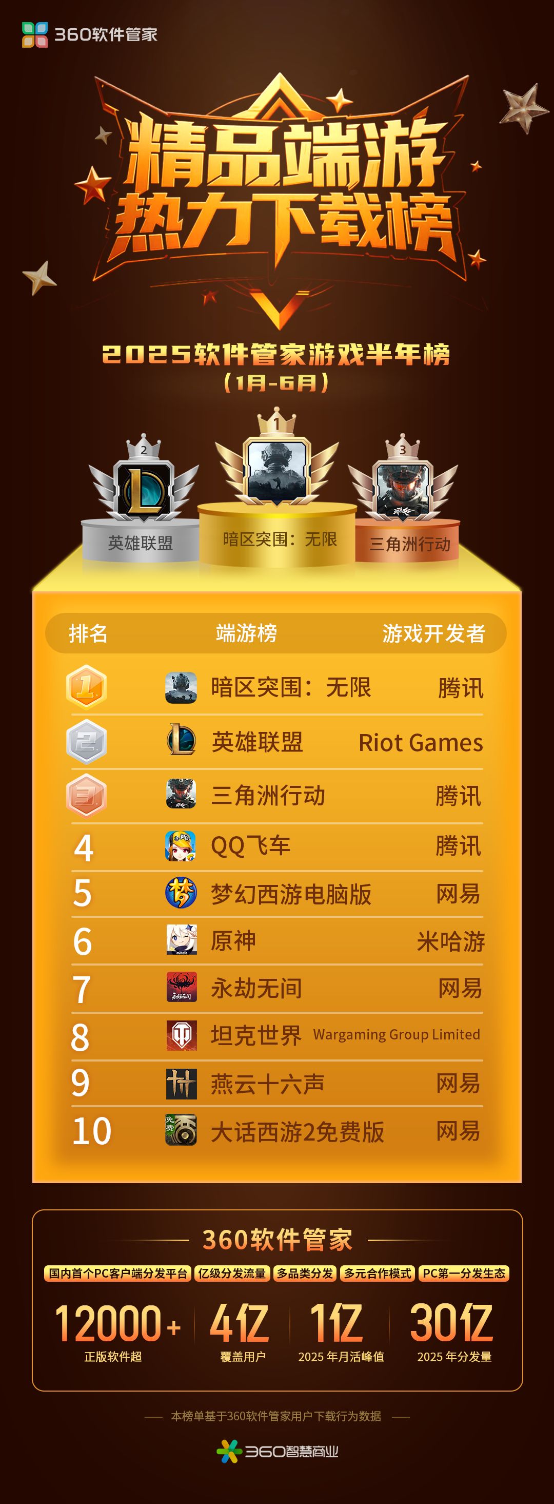 基于平台内海量用户真实下载数据,360软件管家于近日正式发布2025年游戏半年榜(1月-6月)。榜单聚焦精品端游热力下载榜、爆款页游人气下载榜、必备游戏辅助下载热榜三大核心维度,从端游、页游、游戏辅助工具视角,全方位呈现上半年PC端游戏市场用户偏好与发展态势,为玩家高效筛选优质游戏内容提供参考,也为从业者把握市场趋势、优化产品服务提供方向,让优质游戏与服务更好触达用户。