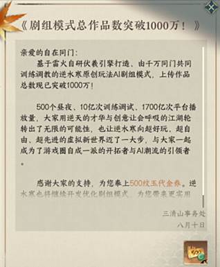 近日,网易《逆水寒》手游宣布,其AI剧组模式用户生成作品(UGC)总量已突破1000万条,标志着游戏内置短视频生态完成规模化验证。
