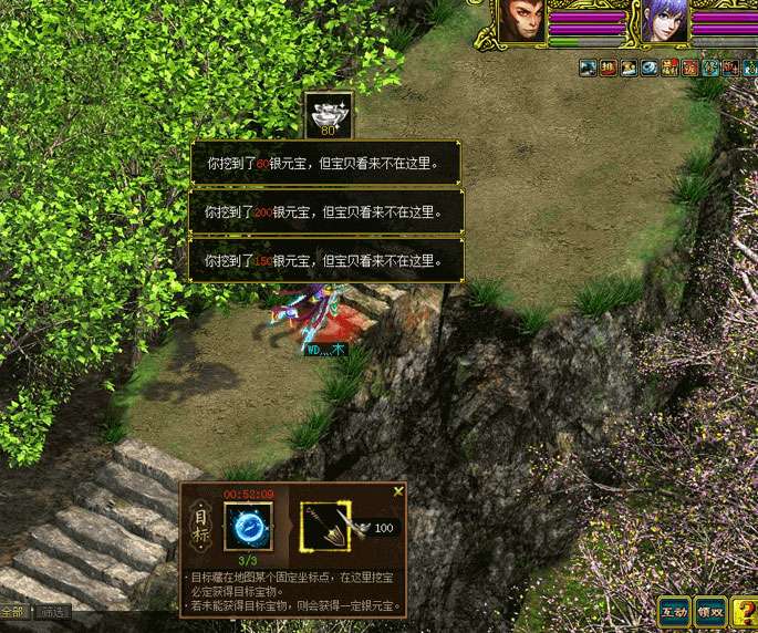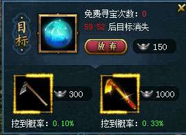 若道友未能直接获得对应道具奖励,但寻到宝物的位置,则可使用300金元宝的“锄头”或1000金元宝的“锄头”挖掘,直到获得奖励(注:每次挖掘都会显示挖到宝物概率)。