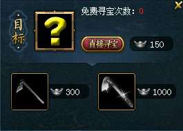 道友点击“直接寻宝”按钮即可花费150金元宝将宝物搜寻出来(一定时间后,所寻得的宝物位置线索将会消失),并有机会直接获得对应道具奖励。注:每日活跃值达到50,100,150可免费获得寻宝次数。