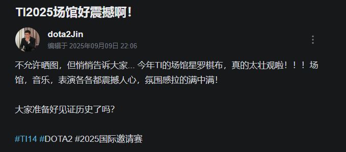 北京时间9月11日下午4点,DOTA2国际邀请赛(TI2025)八强赛将正式于德国汉堡巴克莱体育馆拉开帷幕,而4点开启的揭幕战就是万众瞩目的中国队XG对阵豪门Tundra。本次TI八强赛依旧会有线下开幕式,根据前线主持人Jin发布的动态来看,TI2025的场馆星罗棋布,场馆、音乐、表演都震撼人心,本次开幕式和赛场的氛围感都会拉满。