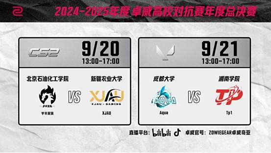 比赛当天,除了线下观赛阵地,我们还将在ZOWIEGEAR卓威奇亚B站及抖音官方账号同步开启直播,让我们共同期待2024-2025卓威高校对抗赛年度总冠军的诞生!