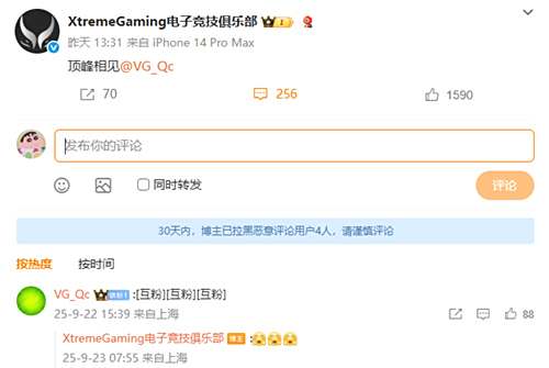 2025年9月22日,XG电子竞技俱乐部官方微博以“顶峰相见”四个字@前VG电子竞技俱乐部老板陈清,引起国内社区热议。在一周前的TI2026确定在中国上海举办后,VG前老板陈清就公开发文表示“希望明年在上海顶峰相见”,并表示“明年在上海我们一定要把不朽盾留下来,为CN尽一份力”。而XG的这次回应,就好像一份强有力的接力宣言,将中国DOTA2两支豪门战队的传承与上海TI2026的野心,推向了最高潮。