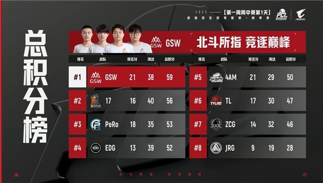 首日赛后,GSW凭借着59的总积分暂居第一,随后是17战队和PeRo战队,战神榜第一名则是给到了PeRo战队的Aixleft。